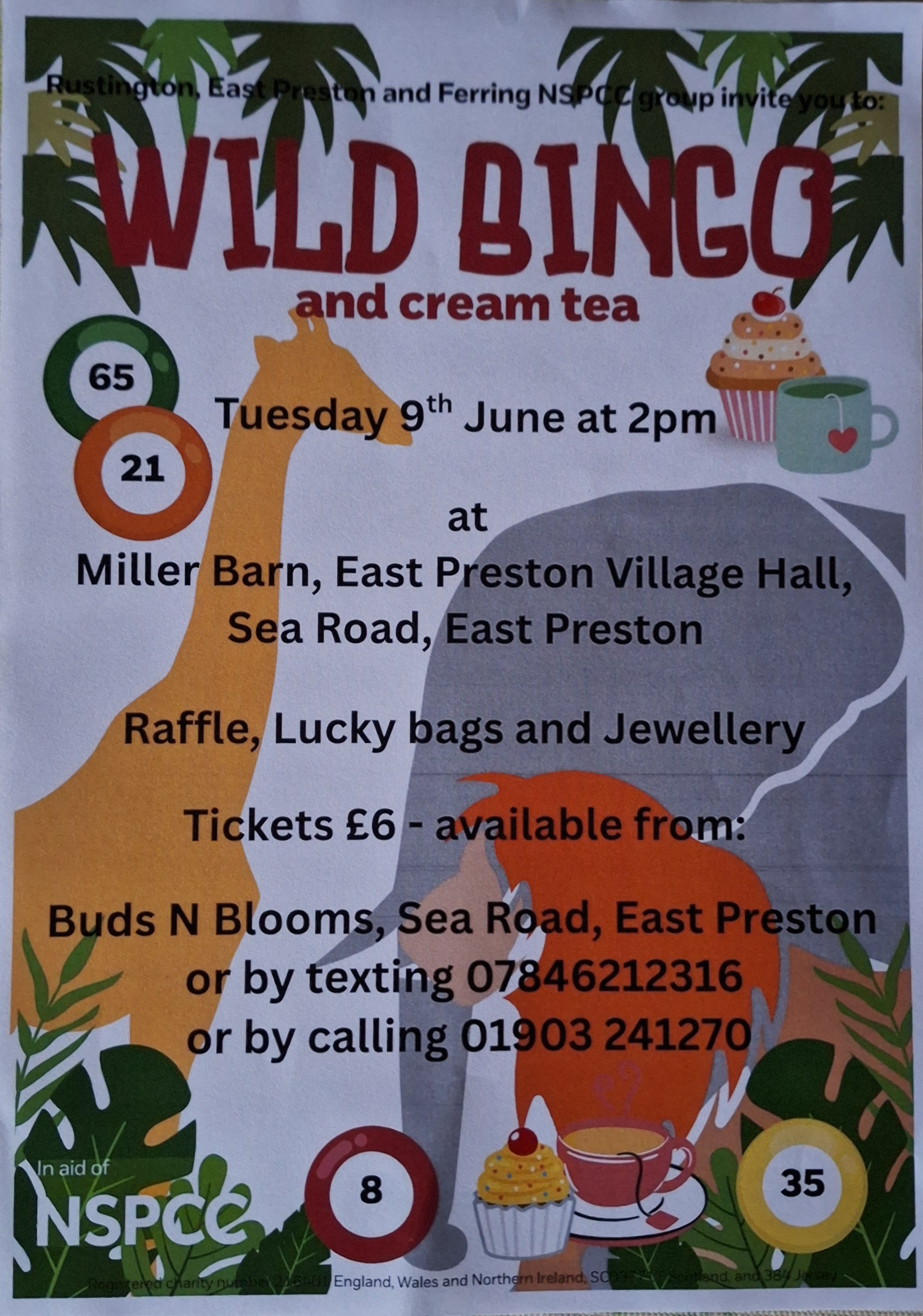 A fun game of Bingo with a wild animal twist, accompanied by a cream tea. Raffle, lucky bags, jewellery. Tickets £6 from Buds 'n' Blooms on Sea Road, East Preston. Or text 07846 212316 or call 01903 241270. All funds to the NSPCC.